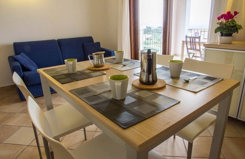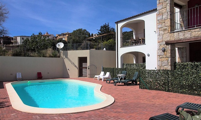 Two-room apartment, bright, first floor with terrace overlooking the pool and the green and from which you can see the sea. 4 beds, a double bedroom and a double sofa bed in the living room, bathroom with shower, fully equipped kitchen, patio, garden for exclusive use, TV, WI-FI, parking, barbecue, swimming pool, solarium with swimming pool. Distance from the sea 2 Km quiet area near the city. Supermarkets and shops nearby. Service station, post office, bank, shops and restaurants nearby