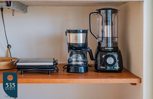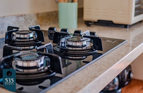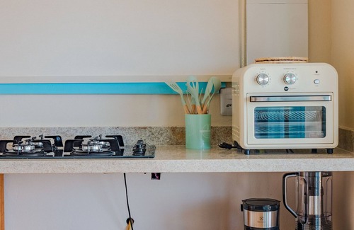 The kitchen is fully equipped with everything you need to cook: a minibar fridge, electric oven, 4-burner gas cooktop, blender, coffee maker, sandwich press, and a table for two. We've also included a dual-compartment recycling bin (for organic and recyclable waste) and a water purifier for added sustainability and convenience.
