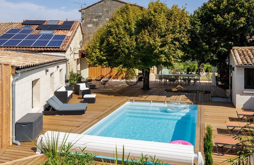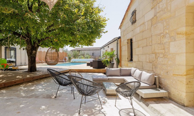 The "10 Personnes" villa is located in the Saint Emilion vineyards. Perfect for unforgettable vacations with your loved ones. The 200 m² property comprises a living room, a kitchen with dishwasher, oven, steam-cooker, beer maker, Nespresso coffee machine, 5 bedrooms (including 3 adults) and 3 bathrooms/shower rooms. It can therefore accommodate 10 people (+ 1 or 2 babies). Additional amenities include a large TV and air-conditioning in the sleeping areas. The villa offers 2 private outdoor terraces (one of which is shaded) and a private outdoor swimming pool (salt water). 3 parking spaces are available on the property. Families with children are welcome. A small pet may be allowed for a fee (please contact the host). Smoking and celebrations are not permitted.