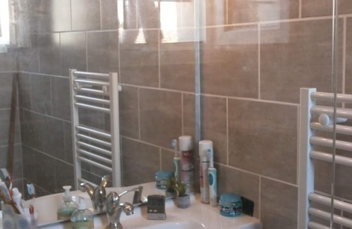 Bathroom with walk-in shower, hairdryer, towel arrangements.