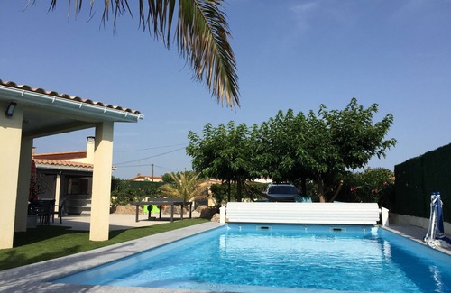 Luxury house with kitchen / dining room, large living room with two relax motorized leather sofas, large screen TV, reversible cim, two large windows overlooking the grounds and the swimming pool, an integrated fitted interior kitchen, 1 bedroom with 160 cm bed with bathroom and shower cubicle, 2 bedrooms with 140 cm beds, one bedroom with bunk beds and a 140x190 sofa bed, another independent bathroom with shower cubicle, 1 independent indoor WC, and a shower with WC outside. A covered outdoor summer kitchen equipped with TV, American fridge. WIFI access.