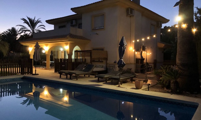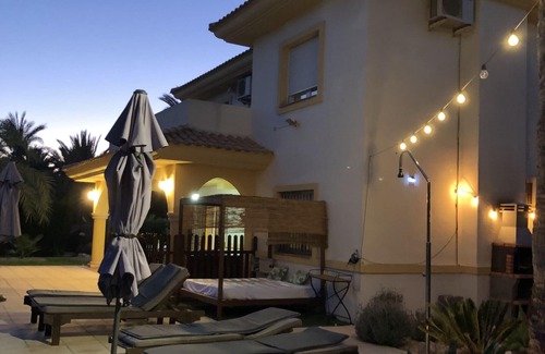 The villa in Mutxamiel has 4 bedrooms and has capacity for 14 people. The villa is cozy, is spacious. The property is located right next to the golf-course. It has views of the mountain and the garden. The property is located 7 km from PLAYA MUCHAVISTA sand beach, 3 km from MUCHAMIEL city, 3 km from VARIOS SUPERMERCADOS supermarket, 26 km from AEROPUERTO DE ALICANTE airport, 36 km from TERRA MITICA EN BENIDORM amusement park / theme park, 36 km from AQUALANDIA EN BENIDORM water park. The house is situated in a family-friendly neighborhood in a residential complex.The accommodation is equipped with the following items: garden, garden furniture, fenced garden, terrace, barbecue, fireplace, iron, internet (Wi-Fi), air conditioning (hot/cold), air conditioning in the living room and in some bedrooms, private swimming pool, open-air parking (2 places) in the same building, 1 TV, DVD.In the gas independent kitchen, refrigerator, microwave, oven, freezer, washingmachine, dishwasher, dishes/cutlery, kitchen utensils and coffee machine are provided.