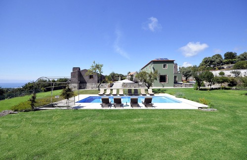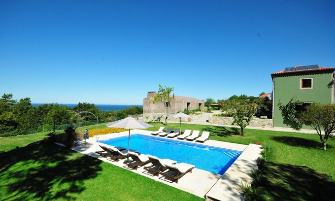 As you approach Casa da Padeira you’re welcomed by flourishing Bougainvillea vines and tall, sweeping pine trees. It really sets the tone of this secluded countryside sanctuary with a breathtaking seaview!This former baker's house has been lovingly restored to create a blissful blend of modern luxury and a traditional farmhouse feel. Stone-clad walls and large shuttered windows complement the state-of-the-art furnishings. Each of the bathrooms has its own unique and colourful floor tiling, adding a touch of personality to each of the ensuites.Open up the shutters and let the sea views pour in. Rolling hills and verdant landscape and uninterrrupted seaviws surround the villa, so picturesque panoramas are aplenty. With various seating areas dotted about the property you'll be spoilt for choice when it comes to putting your feet up and relaxing. Pour yourself a glass of whatever takes your fancy and unwind in this truly tranquil setting.If a little extra privacy is on the wish list, this villa ticks the box. A separate annexe with a bedroom and bathroom sits in the grounds adjacent to the villa, a haven for peace and tranquillity. Each of the further five double bedrooms offer a relaxing place to lay your head. Elegantly designed with light and fresh décor, air-conditioning and your own ensuite. This is the epitome of comfort!If you're looking to enjoy a little healthy competition, the Old Distillery was converted into a two-room annexe, with doors opening to an outdoor decked terrace overlooking the Atlantic ocean, where you can enjoy a game of table tennis or pool in the evenings. With a large living room, the annexe provides the perfect social spot. Outside, the heatable swimming pool takes full advantage of the nurtured gardens. You'll find no better way to cool down than taking a refreshing swim in the pool's glistening waters. The perfect centrepiece to a family holiday of fun in the sun! Elegant sun loungers sit poolside where you can kick back, relax and bask in the Portuguese sun.The modern kitchen fitted with sleek marble worktops offers all the amenities you'll need to rustle up some hearty Portuguese cuisine. The kitchen flows seamlessly into the dining area with a large countryside style chic dining table. The sun pours in through the large wooden windows filling the room with light. A glorious setting for a tasty feast for the whole family.If you're looking to dine under the stars then the spacious outside dining area can't be beaten! Host barbecues late into the evening and spend quality time with your family and friends. And if you're looking to put your feet up and enjoy that extra bit of luxury there's even a chef available for hire.The outskirts of Afife town centre is just over 1km away, which is great if you are looking to tantalise your taste buds with local delicacies or perhaps wine and dine for a special occasion. Blessed with over 3km of stunning golden sand beaches, Afife is a place for the whole family to explore.If you're looking to venture further afield, the town of Viana do Castelo is only a 15-minute drive away. Steeped in medieval history, rich in palaces embellished with coats of arms, churches and monasteries, monumental fountains and water features, Viana is a wealth of heritage worth visiting during your stay in the northern region.Returning to your own private paradise, Casa da Padeira, truly is the ideal destination for a more than relaxing getaway.AccommodationMain house - Two storey villaGround floor:Open plan fully fitted kitchen and dining area seating up to 12 people, with doors opening onto the external terrace with table and chairs ideal for alfresco dining under the vineyard. Living room with comfortable seating and TV. Guest toilet and luggage room.Twin bedroom with ensuite bathroom and doors opening onto a shaded terrace overlooking the pool and lawn. This bedroom is suitable for the disabled. Upper floor:Master double bedroom with ensuite shower room featuring also a free standing stylish bath. Private balcony with immaculate sea views.Further 2 bedrooms each with twin beds and ensuite shower room as well as sea view.Double bedroom with ensuite shower room, pool and sea view. Cottage: Double bedroom and mezzanine above sleeping an extra 2 children or 1 adult. Shower room and toilet. Doors opening onto beautiful large stone terrace partially covered by a sumptuous Bougainvillea. Both the main house and the cottage are fully air conditioned. Old distillery and games room:Together with the main house and cottage, guests have the use of another building composed by the original old distillery (with the original bread / pizza oven) and games room with large (9 feet) pool table. From the living area there is a superb wooden decking terrace with uninterrupted sea view - often called the G&T evening spot! ExteriorSpacious mature garden, sunbathing terraces and lawn. Excellent barbecue area perfect for alfresco dining. Private swimming pool 12m X 5,5m and the depth is from 1.10m to 2.20 metres. Car parking.Tourist TaxAs this villa is located in the municipality of Viana do Castelo, a tourist tax is payable as of 6 of August 2024.HOW MUCH IS THE MUNICIPAL TOURIST TAX? €1.50 in high season: from 1st May to 31st October€1.00 in low season: from 1st November to 30th April WHO PAYS?- Guests aged 16 and over, per night, up to a maximum of 5 consecutive nights (per person and per stay). WHO IS NOT REQUIRED TO PAY? - Guests up to 15 years of age (inclusive); - Guests who come to the Municipality of Viana do Castelo at invitation of the City Council to participate in cultural and sporting events;- Guests and an accompanying person, who come to the Municipality of Viana do Castelo for medical reasons, namely, appointments, exams, and medical treatment. Medical evidence is required;- Guests with disabilities equal or greater than 60%. Medical evidence is required, as well as an accompanying person;- Guests who are staying in the establishments mentioned