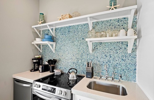 Inside, Villa 4 Sand Dollar welcomes you with a coastal chic open floor plan. The living area offers a plush sofa and TV, plus a dining table for four that’s perfect for meals or family game nights. The fully equipped kitchen has cookware essentials, a refrigerator, stove, microwave, and more, making in-home dining simple and convenient.