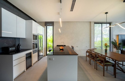 The beachfront front section of the villa is a 135 sq m open-concept, single floor layout with full view of the sea. One large master bedroom with floor to ceiling windows and a gorgeous spa-like bathroom with a soaker tub. Above the Master suite there is a rooftop terrace (140 sqm) with commanding views and barbecue cooking facilities.