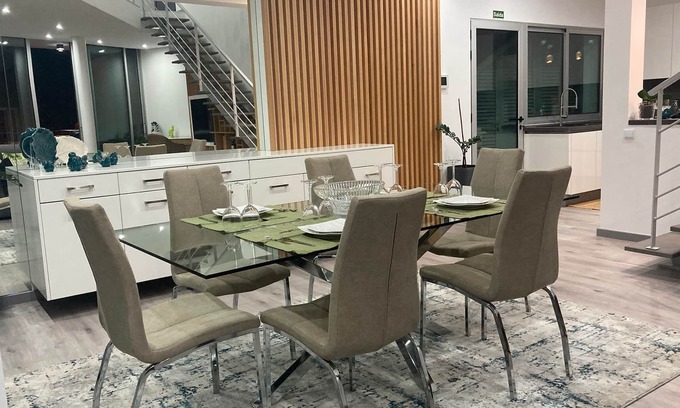 This luxury accommodation offers 2 en-suite bedrooms, 1 huge open space room where you can relax, watch a film on our 65” screen, work in a working area specially created for it, enjoy our wine selection, have your meals or enjoy the outside area of the house or the surroundings, taking advantage of its large windows, 1 fully equipped kitchen for all your needs, 3 bathrooms, 2 large balconies, one of them equipped with a dining area, sun loungers for sunbathing, Jacuzzi for 6 people and outdoor shower and even a laundry room.