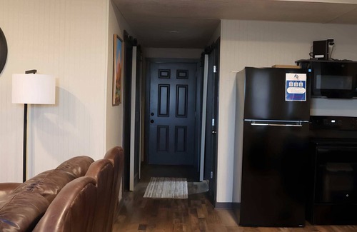 Discover the charm of our modern 1-bedroom, 1-bath suite, thoughtfully designed to offer both comfort and style. The spacious bedroom features a plush, comfortable bed adorned with soft linens, ensuring a restful night's sleep. The open-concept living area seamlessly connects the kitchen, dining space, and living room, creating a warm and inviting atmosphere perfect for relaxation or entertaining. Whether you're cooking in the fully equipped kitchen or unwinding in the cozy living room, this suite is ideal for your getaway, offering a blend of contemporary design and homey comfort. The suite's ambiance is enhanced by modern decor and natural light, making it a welcoming space for any traveler.