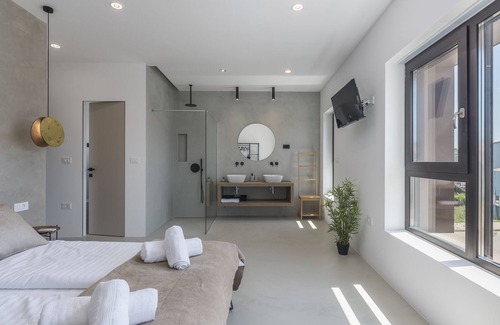 A guest toilet is also located on this living level, while the three air-conditioned and TV-equipped double bedrooms - two of them with shower bath en suite, one with open shower and wash area as well as toilet en suite - are located on the upper floor.