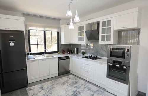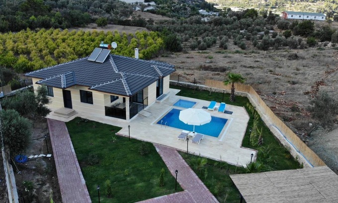 The pool (30m2) and children's pool (8m2) have a mountain view. It has air conditioning, a terrace, outdoor kitchen and barbecue. Private parking, free WiFi, Netflix and Tivibu are also available.