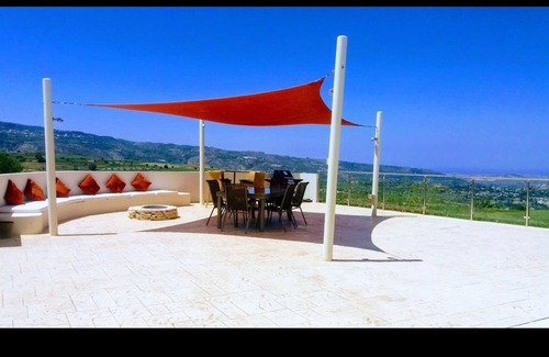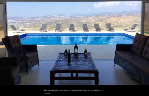 A luxury five bedroom villa near Paphos with option to heat pool and spectacular, panoramic views. From the outside this villa is very under stated, but open the front door and... "WOW"...the view with literally take your breath away. A contemporary villa set in the wine producing region of Paphos. For that "home from home" experience.