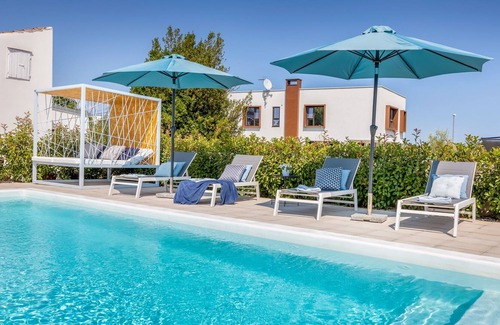 These are attractively complemented by the pool area, which not only offers you the 32 m² pool with salt water, comfortable entry steps and hydromassage, but also a stylish daybed and comfortable loungers for chilling hours under the Mediterranean sky.