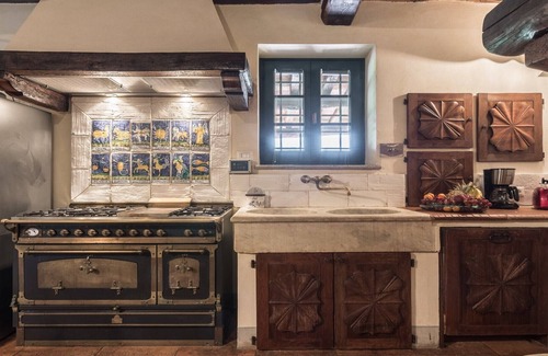The kitchen has a double marble sink, 250 years old and a collection of 12 ceramic tiles with zodiac symbols of the beginning of last century, over the stove.