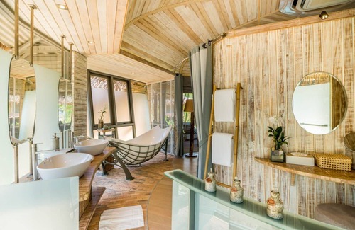 Immerse yourself in refined elegance with a European 'shabby chic' design that beautifully incorporates recycled materials and a colour palette inspired by the jungle and sea. Enjoy your private balcony, complete with a double swing and day beds, or unwind in the stylishly appointed living area with a capsule coffee machine, fully stocked minibar, and more. This is the perfect haven for a couple seeking tranquillity and a touch of coastal charm.