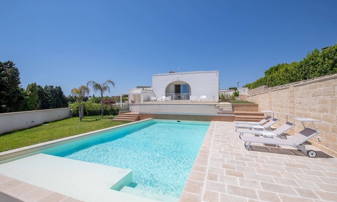 Newly built villa located in Otranto near the center, with a panoramic view of the Adriatic coast of Salento, in Apulia. This splendid villa in Otranto offers all comforts, in a modern style, with light tones. It offers equipped patio with sun loungers and tables, garden with lawn and swimming pool (8 meters x 10 meters). Ideal for a holiday a few steps from the sea and the city center, suitable for families or couples.