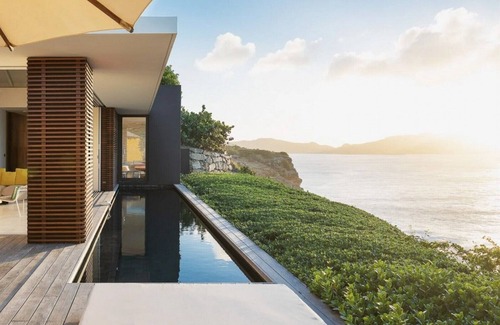 Sharing the stage with that memorable mural is the breathtaking view over the Caribbean Sea far below—Villa BelAmour has a dramatic setting high on a cliffside—the northwestern coast of St. Barth, and the nearby islets of Bonhomme, Frégate, and Toc Vert. On a clear day, you can see St. Maarten and Anguilla. And as the afternoon slips into evening, you can watch the sky turn aflame with the sunset. You can always see the water, as the romantic hideaway is perched on the edge of land, so the water views almost give you the feeling of being in a yacht cabin.