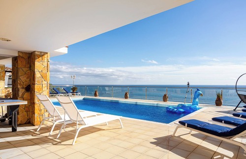 This magnificent house on the seafront with excellent panoramic views is located on the edge of a cliff. It has a large outdoor pool and is situated close to Lloret de Mar. The villa Bergantin has everything you need for a relaxing holiday. The 700 m² property has 5 floors in total. It has access to the rocks in front of the house (delicate access). On the street level it has uncovered parking for two cars. We go down to the first floor where we find a living room, a bathroom with a shower, a terrace with a barbecue area and a chill out area, a kitchen and a second TV room with a covered panoramic terrace. On the lower floor we have 4 bedrooms with 3 bathrooms and a lounge. Underneath we have access to the large pool with a bar area and a courtesy toilet. Finally, below again there is a closed floor with a spa area with an indoor pool (it can be heated with a supplement) with an internal Jacuzzi and sauna and a complete bathroom with a shower. Additional amenities include high-speed Wi-Fi (suitable for video calls) with a dedicated workspace for home office, air conditioning, a washing machine, a dryer as well as a TV. Furthermore, a pool table is available on the property. A baby cot and a high chair are also available. The house has a sixth room with a double bed and a private bathroom for two people. This has an extra daily price
