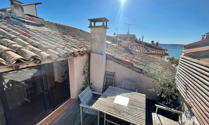 On the 2nd floor a bedroom with a 140cm bed, a bathroom + WC, an attic bedroom with a 140cm bed. A terrace overlooking the roofs out of sight where you can enjoy your meals, a sunbath ......free parking spaces nearby