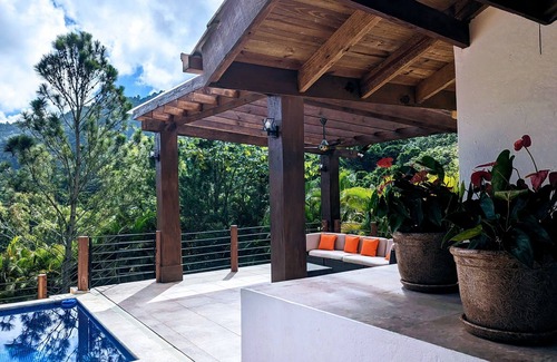 Villa Brisal, a heartbreaking mountain view, in the exclusive community of Mata de Platano, private & fully fenced. Pool & jacuzzi with optional heater, gardens, open deck, BBQ. Six bedrooms with fans and five with ac, all with a private bathroom, 2-family T.V. rooms, inverter, equipped kitchen, private parking, and much more...