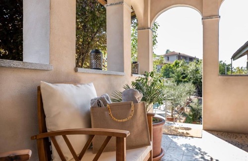 This vacation rental boasts a private outdoor space with a pool, garden, open terrace, covered terrace, and balcony.