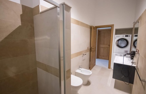 The bathroom has an ample shower and a hairdryer, washing machine and dryer.
