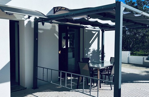 Terrasse équipée d’une pergola et barbecue, au calme, à environ 7 minutes en voiture du centre.