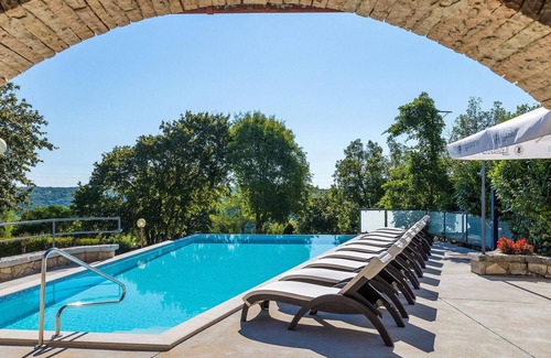 The beautiful Villa Casa Travertina is located near the town of Tinjan in central Istria, overlooking the unspoiled nature of the Lim Valley. This spacious villa is an ideal destination for a relaxing vacation on the Istrian peninsula. Villa Casa Travertina can accommodate up to 10 people in 5 bedrooms, each with its own bathroom. The interior of the villa conveys a playful elegance resulting from the interplay of warm colors, carefully selected artwork and a sense of spaciousness. The first floor consists of a sauna, a gym, a bathroom, a billiard room, a beautiful living room with a dining area, a minibar, a fully equipped kitchen with everything you need to prepare delicious meals for your family and friends, and a bedroom with its own bathroom. On the second floor there are 4 bedrooms and each has its own bathroom. The interior of the house opens up to a large front porch that houses the outdoor dining and barbecue area, a living area and a luxurious 7-person Jacuzzi with adjoining sun terrace surrounding the saltwater pool. The ambience is enriched by a large garden where various species of trees and some typical Mediterranean herbs grow. Due to its characteristics, Villa Casa Travertina is suitable for a real hedonistic vacation as well as for an active vacation where you can explore the beautiful surroundings.