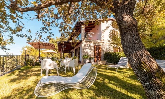 Villa Chiara is a prestigious and comfortable villa with a stylish interior and a panoramic view overlooking the sea in the small village of Ascea Marina. Located in a residential area of the town about 1 km from the long sandy beaches of Ascea Marina, the villa is the ideal starting point for anyone who wants to visit the most beautiful and exclusive resorts in the Cilento and enjoy at the same time the tranquility and nature. The villa can comfortably accommodate 10 people and is on two levels. The ground floor consists of a modern and stylish living room with a fully equipped kitchen with a refrigerator and dishwasher, dining room with table and chairs, two double bedrooms with quality mattresses, small fridge and bathroom with shower and bidets, in one of the rooms there is a comfortable sofa bed. The first floor, reached by a modern wooden staircase, is composed of two double bedrooms with quality mattresses, small fridge and bathroom with shower, bidet and hair dryer. The exterior is characterized by the presence of a private parking and a private garden with panoramic views of the sea and the Archaeological site of Elea-Velia. The exterior is characterized by the presence of majestic oak trees that provide an ideal climate, an exclusive garden terrace with lawn and two large terraces overlooking the sea with furnished garden where you can dine in complete relaxation. Behind the villa there is a second independent equipped kitchen with adjoining outdoor dining area with a local stone floor, wooden benches and tables ideal for organizing great dinners totally immersed in nature. Facilities of the villa are the lovely organic garden that the owner makes available to guests, where you can enjoy the seasonal products of the Mediterranean Diet, air conditioning, refrigerator, mosquito nets, parking and wi-fi. The road leading to the villa is uphill, car required.