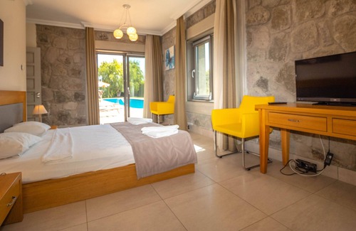 Family Holiday Villa with private pool in Bodrum Turkey at Ortakent, Bodrum. Sleeps 10 private location Villa Clara in Ortakent, Bodrum is a large and spacious family or couples holiday villa for leisure and pleasure. Set in large mature private gardens Villa Clara ensures privacy to its guests This villa can sleep 10 guests and has a large private pool, 25m x 5m Olympic size, a lovely veranda for shaded seating and extensive lawned garden, You are sure to have enough room for your whole group throughout the 5 bedrooms, 5 bathrooms and stylish living space. However, if you do wish to explore the local area and get out for a while you are only 800m away from the nearest resort for all you may need. Inside Villa Clara there is a clever mix of modern and traditional chic, creating a very pleasant stylish look, unfussy, clean and uncluttered. Stone walls and beamed ceilings help keep the villa cool (there is also full A/C throughout the villa). The entrance floor has 2 double ensuite bedrooms and a further 3 bedrooms are on the first floor. Villa makes an ideal choice for family holidays and large groups.