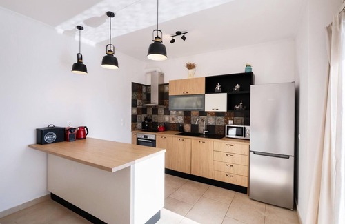 The kitchen is air-conditioned and features a toaster, washing machine,