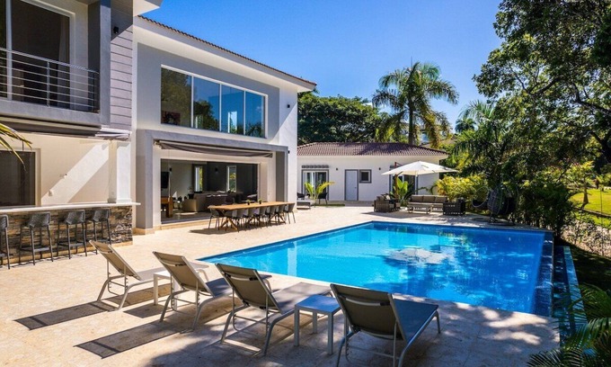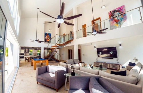 Villa de Collie is an exquisite 7 Master bedrooms with King size bed and 9 bathrooms modern, avant-garde style villa located in a natural setting. The Villa is in the exclusive Residential Hispaniola gated resort community. This villa features more than 4,000 sq feet of interior living space The Villa has an open living area for entertaining large groups featuring 20+ foot ceilings, a floating staircase, billiard table, large infinity pool, outdoor kitchen with gas grill.