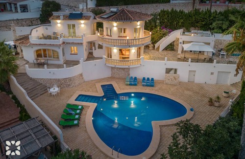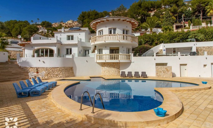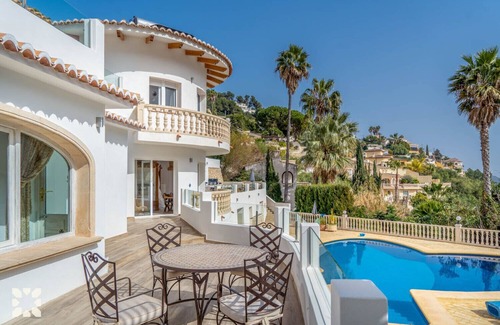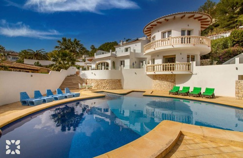 EXTRAORDINARY VILLA WITH CIRCULAR ARCHITECTURE LOCATED IN MORAIRA (COSTA BLANCA) WITH PRIVATE POOL AND SEA VIEWS. For a maximum of 12 guests.LAYOUT: The villa CONDOR, in Mediterranean style, is distributed over two floors. The main entrance of the villa gives us direct access to the living room, open and continuous space that communicates in several relevant rooms for our comfort as the dining room and the kitchen. The living room has a comfortable sofa and two armchairs, as well as a coffee table and a television, forming an ideal setting to share a moment of relaxation. All the decorative elements of this large space shine thanks to the soft sunlight that enters through the large windows. The kitchen, completely renovated and modern, has everything you need to prepare meals, such as a large table, very practical and spacious enough to gather all the guests, is right next to it. On this floor there are two bedrooms, both with two single beds joined together, both of which are bright and cosy. A bathroom with bathtub is at our disposal. A sensational spiral staircase leads to the first floor where you will find an en-suite bedroom with two single beds and a bathroom with shower. A large terrace is at our disposal with a chill out area to enjoy the magnificent sunrises and sunsets. The fourth bedroom is located in the right wing of the villa, right in the tower, and has a circular structure, which offers a lot of personality to this space. It is a bedroom with an en-suite bathroom consisting of two single beds joined together plus a trundle bed. Taking the external stairs we reach the last bedroom, a suite with a private bathroom with shower and a magnificent split bed.EXTERIOR: The villa CONDOR has several outdoor spaces to enjoy the magnificent sea view and the Mediterranean breeze. The main terrace consists of a large table for 10 guests and an outdoor kitchen equipped with barbecue. At the top of this space is a chill out area where sharing moments of joy and relaxation with others will be an extraordinary combination. The swimming pool is situated in the lower part of the villa, its distribution is unique and singular, at the height of very few villas. There are sun loungers, as well as a large and functional outdoor shower. The entrance to the villa offers enough space to park several vehicles. The plot has plants and trees typical of the Costa Blanca giving a natural touch to the villa making it a sublime location.SITUATION: Villa CONDOR is located in a quiet and residential area with magnificent views of the surroundings and the sea as a backdrop. We will be located just a few minutes away from all kinds of services such as restaurants, supermarkets and leisure activities offered by the charming town of Moraira, Calpe and Benissa.OTHERS: FREE WIFI, AIR CONDITIONING THROUGHOUT THE VILLA. SEA VIEWS.