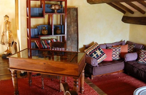 Large living room with fireplace opening onto 2 terraces overlooking the garden, Satellite T.V and a loft with living room/meditation room, double bedroom with 4 poster bed, satellite T.V. Bathroom with shower, double bedroom with loft and round bed, satellite T.V.