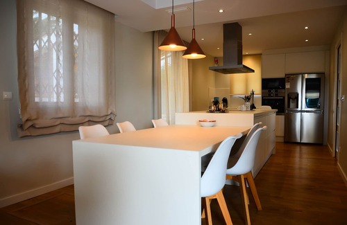 Villa Cristina is located in the quiet urbanization of Rocas Doradas, 50 meters from the "Bon Caponet" beach and 5 minutes from the urban center of Ametlla de Mar. The house is composed of ground floor and first floor, has 8 bedrooms and 3 bathrooms for accommodation of up to 18 guests. In the area of the ground floor we have a large terrace with southeast orientation around the pool with direct access from the spacious living room, its completely renovated interior is composed of an open kitchen fully equipped with an elegant central island of Dekton that extends To form a side table of the same material, from the kitchen we can access a covered outdoor barbecue. The adjoining living room, dominated by an elegant sofa, has a TV with parabolic connection and since the whole house is WI-FI, from the living room through the huge windows you can see the entire pool area and terrace . Finally the dining room is an attached room that is on the side of the room and can be accessed directly or by the terrace since its folding windows located on two of its four walls allow to have the space connected to the pool area creating a single environment. In the north wing of the ground floor there are 3 double bedrooms and a bathroom. The first floor houses the rest of the 5 double bedrooms and the two bathrooms that complete the accommodation. It should be added that the house has air conditioning in all rooms, as well as a small stove in the dining room for the winter months. capacity for 6 vehicles inside the farm.