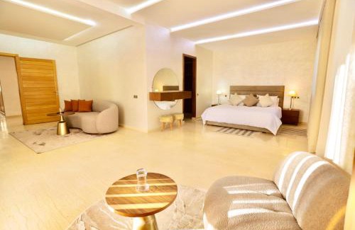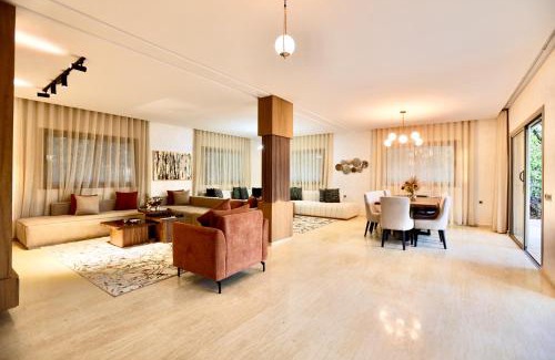 Providing a garden, *Villa de luxe à Marrakech, vue sur les montagnes* offers accommodations in Marrakesh. This property offers access to a balcony, free private parking, and free Wifi. The villa has a year-round outdoor pool and a solarium. Offering a terrace and mountain views, the spacious villa includes 4 bedrooms, 4 living rooms, flat-screen TV, an equipped kitchen, and 4 bathrooms with a bidet and a bath. Towels and bed linen are featured in the villa. The property has an outdoor dining area. Bahia Palace is 14 miles from the villa, while Boucharouite Museum is 14 miles away. Marrakech-Menara Airport is 17 miles from the property.