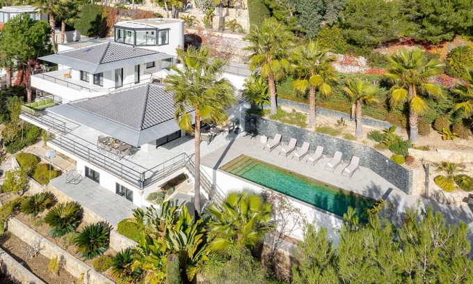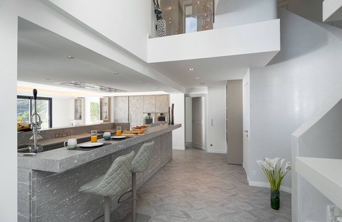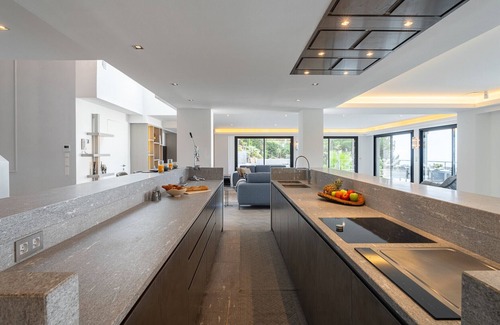 From the entry a grand staircase winds down to the impressive open living space and dining room with large picture windows overlooking the pool and terraces, all with breathtaking views. The modern kitchen is centrally located in the same space and fully equipped with high end appliances, two dishwashers, two hobs and spacious American fridge.