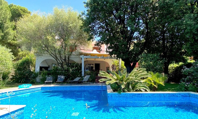 Gorgeous detached villa with private salt-water pool 300 m away from sandy beach.Accommodation registration number: IT092037C2000Q9292Sleeps 7, 4 bedrooms and 3 bathrooms, short walking distance to sandy beach.I have the pleasure to propose for rent Villa Dharma, my family holiday villa in the gorgeous Torre delle Stelle, in the South East coast of Sardinia. Villa Dharma has the benefit of private swimming pool and luscious garden. The villa is surrounded by an enchanting garden with lots of Mediterranean shrubs and mature trees. The position of the villa makes it ideal for anyone looking for a relaxing holiday possibly car-free from June to October. Villa Dharma is, in fact, located at just 300 m from a gorgeous white sandy beach called Genn’e Mari and less than 100 m away from the nearest foodshop, bar, restaurant and pizzeria. Everything can be reached on foot.However, should you decide to rent a car to explore the many natural and historic beauties that South Sardinia has to offer, Villa Dharma also offers the benefit of off-street parking for two cars. The water in the pool is salted which makes it healthier and more suitable for people with sensitive skin or allergic to chemicals. The accommodation of Villa Dharma is on two floors. The ground floor has just been entirely modernised with brand new open plan kitchen, dining living area and two sets of French doors that give access to a large covered veranda that overlooks the luscious garden and the pool.The veranda is perfect for al fresco dining and it has the benefit of built-in barbecue. There is also a full shower room (the blue one in the pictures) whose access is from the veranda. The first floor comprises of: •4 bedrooms (two double, one twin and one with a bunk bed) • 2 bathrooms (one of which en-suite to the master bedroom). The master bedroom and the room with bunk beds have doors to a shared veranda from where you can see the sea. The second double bedroom also has an independent entrance. The villa is ideal for two families or three couples. The area.The villa is within the enchanting village called ‘Torre delle Stelle‘. ‘Torre delle Stelle’ literally means ‘Tower of the stars’ and it takes the name from the ancient tower that dominates the whole area. All streets are also named after stars and constellations.The position the villa occupies is particularly happy. It is, in fact, at very short walking distance from all the local amenities. The nearest bar, shop and restaurant are 100 m away. The nearby beach is 300 m away and it is walkable by children as well. Villa Dharma is also at just 300 m away from the local park.Shops and amenities.Torre delle Stelle is an environmentally protected area and its beauty has been enchanting visitors since it was created 40 years ago. It has therefore become one of the most sought after areas of South Sardinia. Torre delle Stelle has 2 easily accessible sandy beaches, Genn’e Mari and Cannesisa. It also boasts a few sandy and rocky coves that can be reached either by boat or swimming.There are shops, restaurants, bars and pizzeria in the village. Torre delle Stelle is, however, only partly inhabited all year round Shops and restaurants are therefore not opened every day of the year. They are, in fact, opened every day (7 days a week) from the end of May to the end of October. For the rest of the year one of the supermarkets and the nearby bars are opened from Friday to Sunday included. It is therefore possible to stock up with groceries and food during the weekend. Another option would be to go to one of the supermarkets on the way to Cagliari. The drive is of roughly 15 minutes. Beach bars are usually opened from June to September.Both local beaches are ideal for snorkelling and for scuba diving.Torre delle Stelle, thanks to its position, is the area of Sardinia that enjoys the longest summer. It is in fact said to have her own micro climate.