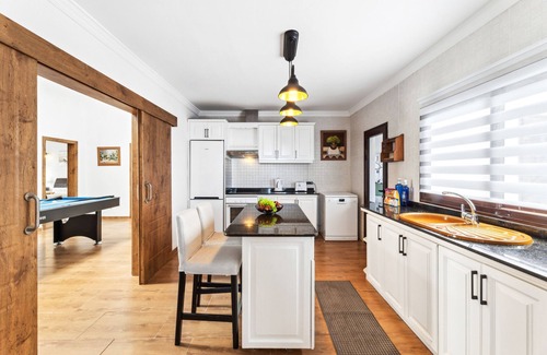 The heart of the house is its wide and bright living room, a vibrant space where natural light floods every corner. Here you will find comfortable sofas for your moments of conversation or to enjoy a movie on the television with international channels. If you feel like having some fun, the billiards table awaits you to challenge your travel companions. Next to this space, a wooden dining table invites you to enjoy memorable meals and dinners.