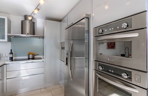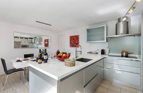 The ground floor consists of a spacious living/dining area. An entire wall is made up of large glass doors which open directly onto the swimming pool terrace. This light-filled room is furnished with two large sofas, chic armchairs and a wooden dining table. The separate, ultra-modern, fitted kitchen is fully equipped with an induction hob, oven, microwave, dishwasher, fridge, freezer. There is also a dining table in the kitchen for more casual meals. Large sliding glass doors open onto a separate lawn.