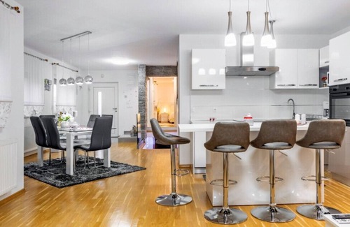 Discover a charming rural retreat nestled in Gornji Kneginec, perfect for families and couples seeking a peaceful getaway. This modern, tastefully furnished home offers a comfortable and inviting space across 98 square metres, set on a spacious 2000 square metre plot.The property features two beautifully appointed bedrooms, each with a luxurious king-size bed, ensuring a restful night's sleep for up to 6 guests. Two well-designed bathrooms - one with a shower and another with a toilet - provide convenience and privacy for all occupants.The heart of the home is the American-style kitchen, fully equipped with modern amenities including an induction cooktop, fridge, freezer, oven, microwave, dishwasher, coffee machine, and a complete set of kitchenware and dishes. A washing machine and toaster complete the kitchen's functionality.Enjoy the comfort of central heating and air conditioning, ensuring a pleasant environment year-round. Stay connected with complimentary WiFi and entertainment options including a TV with satellite channels.Outdoor enthusiasts will love the private features: a fenced plot, garden, barbecue area, and terrace with garden furniture. Relax and unwind in the private sauna and spa, or take a refreshing dip in the 4x6.2 metre swimming pool.Practical amenities include two covered, private parking spaces. The property is pet-friendly, allowing one furry companion to join your stay. Located just 8 km from Varaždin and within reach of Zagreb Airport, this home offers the perfect blend of rural tranquility and convenient access.Note: Smoking is not permitted, and the property is not suitable for youth groups.