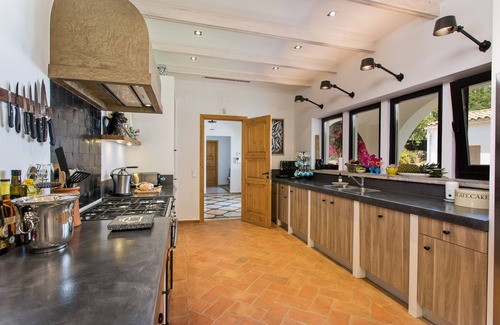 See also the floor plan in the photo gallery. Through the closed entrance gate and the driveway with parking for at least 7 cars you reach the fully air-conditioned villa. This is all ground floor and barrier-free, with 5 bedrooms, 4 bathrooms and a guest toilet. Through the beautiful hall you enter the cosy living room with a wood stove and a large dining table. From here you have access to the veranda, garden, swimming pool and in the back to the kitchen. In this huge kitchen, of course, nothing is missing. There is a separate snooker room for the adults across the courtyard. Here is also a separate laundry and ironing room. On the beautiful patio by the kitchen is the table tennis table and is the built-in barbecue. Attached to the house is a beautiful swimming pool (13 x 5 m!) with 8 sunbeds and there are several places in the garden or courtyard to retreat to. The intimate veranda at the house offers nice shelter at the large wooden outdoor table (10-12 people), from where you overlook the pool and garden. Nice are the hidden places in the garden, such as the bocce court, the rocking chair, 2 fountains and a place with beautiful views over the ocean. 3 spacious bedrooms have a double bed, French doors to the outside, a private bathroom and a satellite TV. 1 bedroom has 2 single beds and the 5th bedroom has a large bunk bed, ideal for children. These 2 rooms share a bathroom. 1 bathroom has a shower and a bathtub, the others have a nice walk-in shower. There is a separate guest toilet in the entrance hall and an outdoor shower.