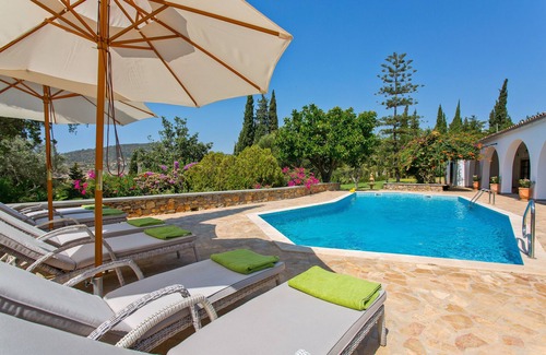 This beautiful, colonial-style Villa dos Ciprestes is hidden between the green of the 10,000 m2 subtropical and flowery garden. In and around the house there is a serene, almost oriental atmosphere, with several great views to the ocean and at night to the twinkling lights of coastal towns like Faro. The villa owes its name to the more than 200 cypress trees that were once planted, many of them along the 150-meter long driveway... The villa belongs to our most luxurious offer, because of the very high level of finishing, the large spaces, the completeness of the furnishings and facilities, the beautiful garden with large pool and the tasteful styling both inside and out. The covered veranda with its attractive arches is enchanting, especially in the evening, when the garden including the pool is illuminated. The house is also suitable for children, they can enjoy swimming or roaming through the enclosed tropical garden.* There is a bocce court and table tennis table. In the garden there are many flowers and Mediterranean fruit trees such as orange, lemon, plum and fig, where you can pick the fruits.