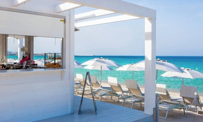 The crystalline waters, with blue and turquoise tones, are shallow, making this beach particularly suitable for families with children. Along the coast, you will find equipped bathing establishments, ideal for those seeking comfort, together with stretches of free beach for those who prefer a more natural experience.