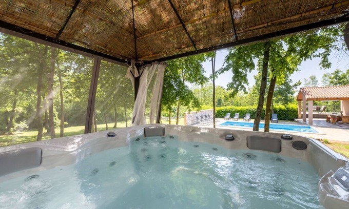 Brnjci little village of only 50 inhabitants. There is situated Villa Eden , holiday Four Star villa which is not just another villa in a series of Istrian villas . Located on one of the most interesting locations in eastern Istria.Located only 10 km from the sea, Villa Eden from every corner has unforgettable view of the forest and green area around her , also because of villas distance from the city , noise and lighting , smooth you can enjoy the sky full of stars and chirping crickets concert .Villa St. Nikola is an ideal vacation spot for those looking for a real relaxing holiday far away from the mass tourism . The villa comprises of 4 furnished and individually decorated rooms, and a lot of outdoor space even 10 000 m2 makes it ideal vacation spot for nature lovers.Picturesque environment of the villa , to wake up with a unique view of the hills surrounded by green area , absolute isolation and the rest from the city bustle , and the special attention we pay to the needs of our guests , certainly guarantee a pleasant and unforgettable holiday.Villa Eden is situated in Županici (near Rabac), 29 km from Opatija. The property is 35 km from Rovinj and free private parking is provided.The kitchen is fitted with an oven. A TV with cable channels, as well as a CD player are offered. Other facilities at Villa Een include a outdoor pool, outdoor kitchen.Dining room is particularly interesting. In the room dominated a large fireplace and wine presented with a large selection of quality Istrian wines. They also have satellite TV, WiFi Internet access What makes this property special is its truly amazing location. The house belongs to a huge plot of 9. 400 m2 fully preserved nature, with all kinds of Mediterranean Villa with pool for 8-10 persons is situated in village of Županici, 29 km from Opatija. The property is 35 km from Rovinj and free private parking is provided.The house consists of two double bedrooms with private bathrooms, a living room with a sofa bed to accommodate two more persons, kitchen and dining room.
