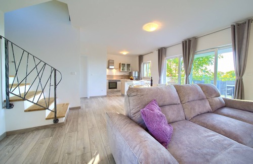 Holiday home Elena is a new beautiful and charming villa. This villa can accommodate up to six people. The ground floor has an equipped kitchen, dining table, separate toilet and living room with a large sofa offering sleeping accommodation for 2 additional people. Outside there is a terrace with a table for 6 people with a pool, loungers, outdoor shower and a barbecue. On the first floor there are 2 double bedrooms and 2 bathrooms. Each room has a private bathroom with a shower and a balcony with a sea view. There are also private parking spaces. The rooms are air-conditioned and fully equipped for a perfect holiday.