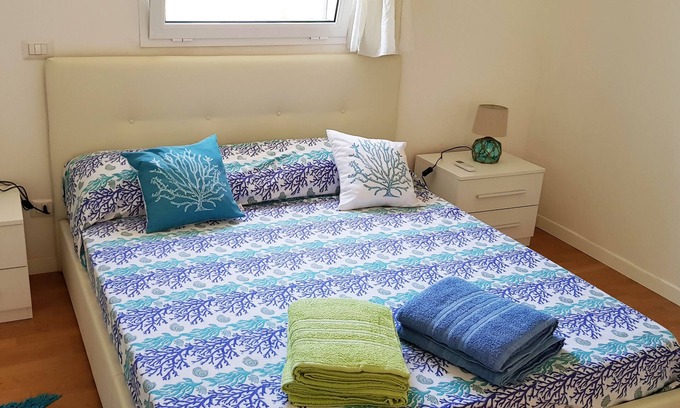 The apartment consists of two double bedrooms, large bathroom, living room with sofa bed, large kitchen, large outdoor patio of 50 square meters with wooden tables and beds. Super-equipped kitchen complete with pots and glasses.