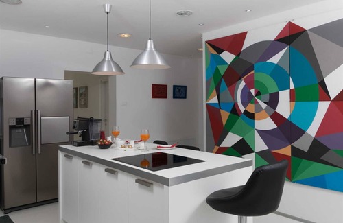 The interior of villa Evergreen is modern and radiant. The kitchen has a breakfast bar and is fully equipped. The living area features cozy sofas, a flat-screen TV, and artistic pictures. There is a small library next to the living room, where you can enjoy a glass of wine.