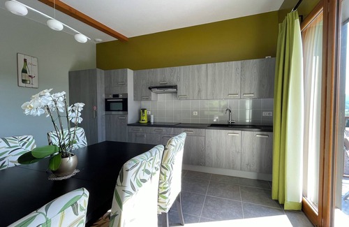 * 1 large, pleasant and very sunny living room, 1 fully-equipped open-plan kitchen (induction hob, extractor hood, combi oven/microwave, dishwasher, fridge, kettle, Senseo coffee machine, toaster, etc.) and all the cooking utensils for 5 people.