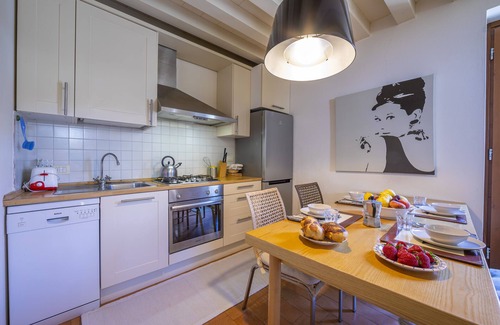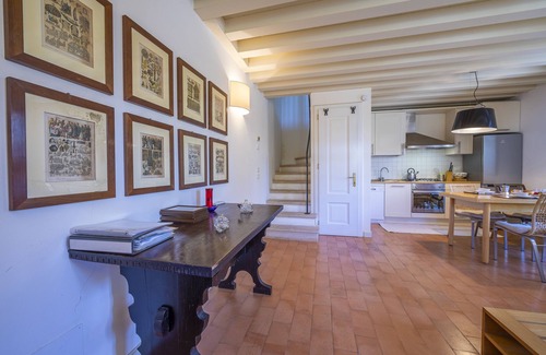Sheltered in a typical 18th-century Veneto villa, this ground-floor apartment in a historical building comfortably accommodates up to two guests with children. It is located on the gentle Veronese hills known for its excellent wine production and splendid views of the surrounding vineyards. The spacious communal area welcomes its guests to a shared garden and a shared pool with sun loungers to have a relaxing holiday. The air-conditioned apartment has a rustic charm spread across two floors with a cosy living room and a kitchen on the ground floor, and a double bedroom with a private balcony on the first floor.
