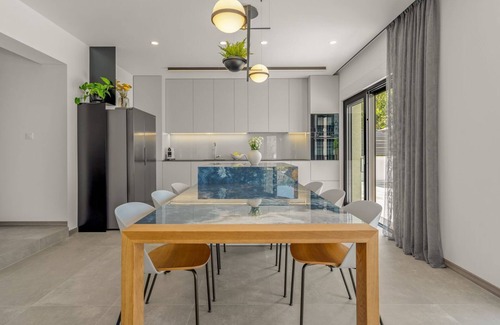 The main living area inside the villa is light, spacious, and filled with homey touches, making this stay a home away from home. A stylish modern kitchen sits to one side, with a marble-topped island in the middle and all the amenities you need for an effortless stay, including a Nespresso coffee machine. A glass-topped table seating six guests sits beside the island with a modern suspended light fitting above. For those wanting an extra slice of relaxation, hire your own private chef for the evening or an in-house masseuse to ease any tensions away, both at an additional cost.