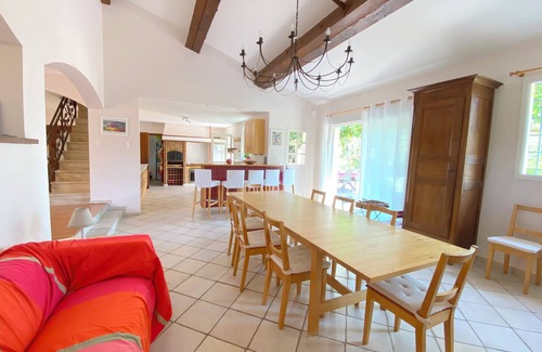 Contemporary 230 m² villa, fully equipped, set in a 2,000 m² enclosed garden with trees, featuring a large secure saltwater swimming pool and a pétanque court.